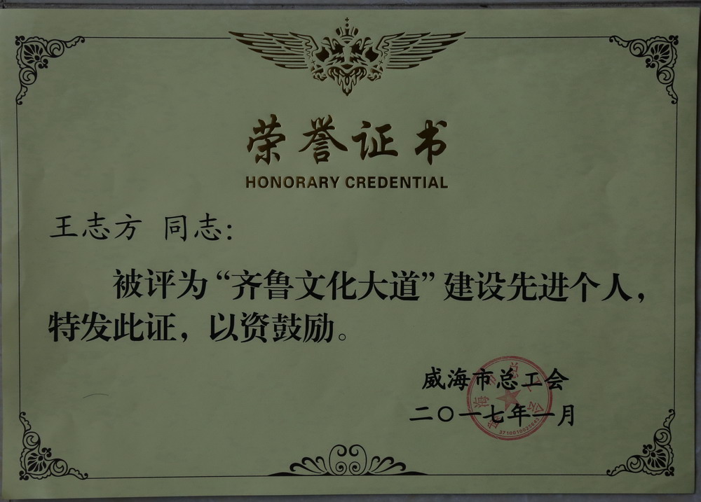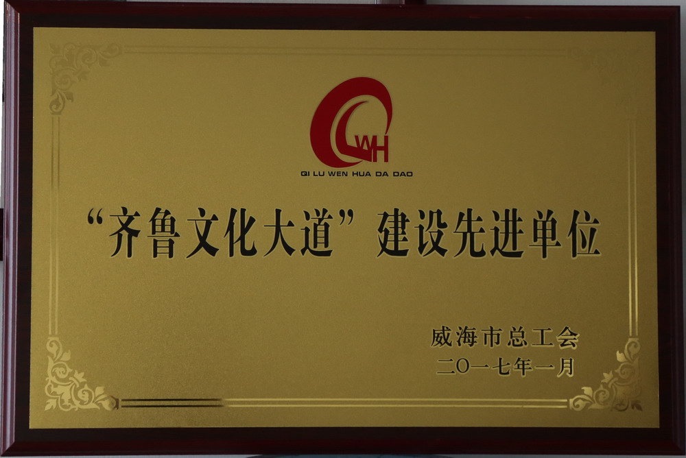 近日,集团公司被威海市总工会授予“齐鲁文化大道”建设先进单位称号。王志方总经理同时荣获“齐鲁文化大道”建设先进个人称号