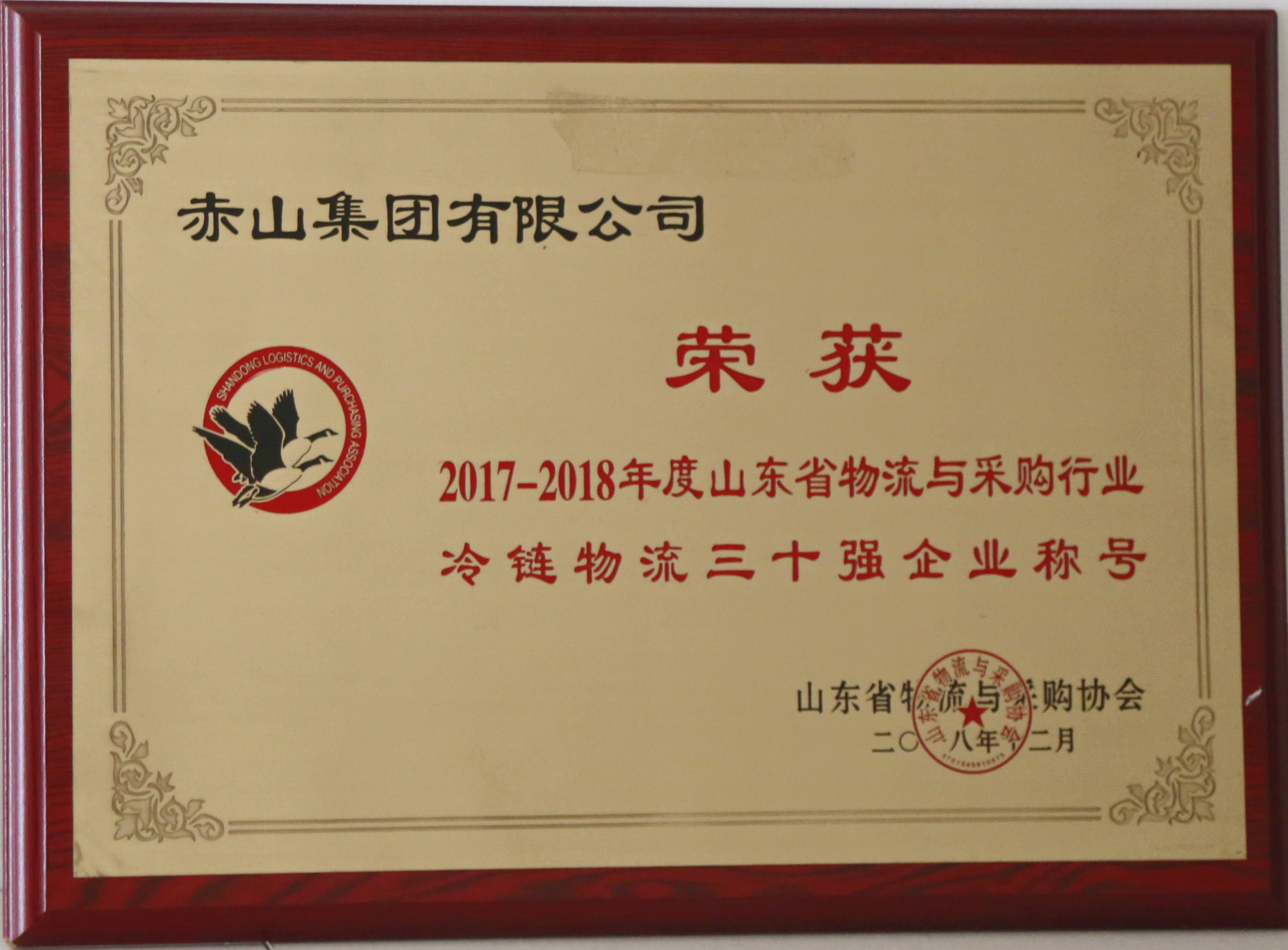 2017-2018年度山东省物流与采购行业冷链物流三十强企业称号